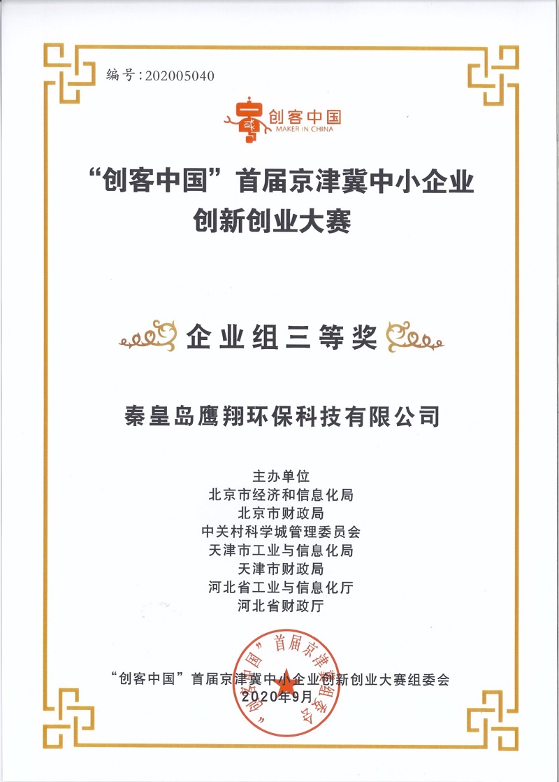 喜報!秦皇島鷹翔環保科技有限公司榮獲“創客中國”首屆京津冀中小企業創新創業大賽企業組三等獎